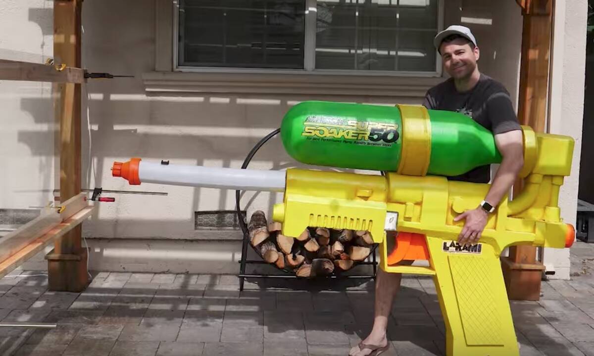 ガラスをぶち破る破壊力 玩具の水鉄砲を超巨大化